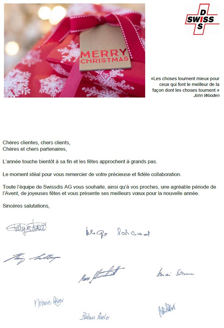 Toute l’équipe de Swissdis AG vous souhaite, ainsi qu’à vos proches, une agréable période de l’Avent, de joyeuses fêtes et vous présente ses meilleurs vœux pour la nouvelle année.